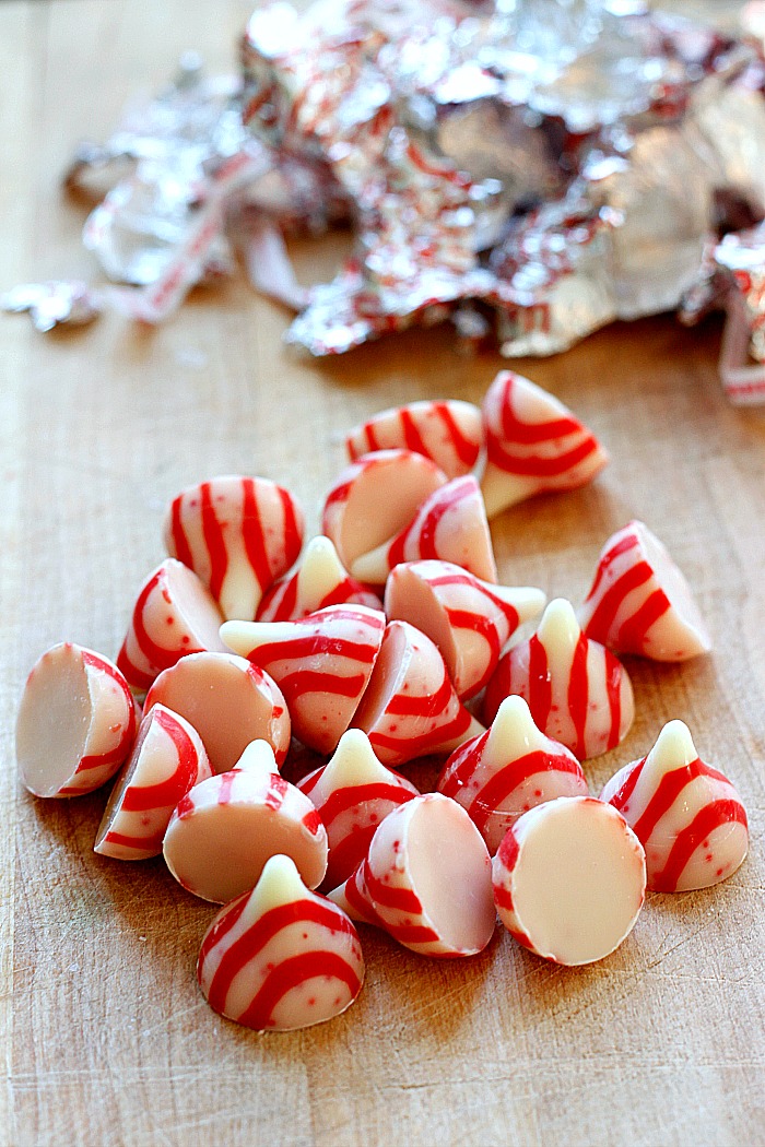 - 1 cup roughly chopped peppermint kisses (about 20-25 pieces)